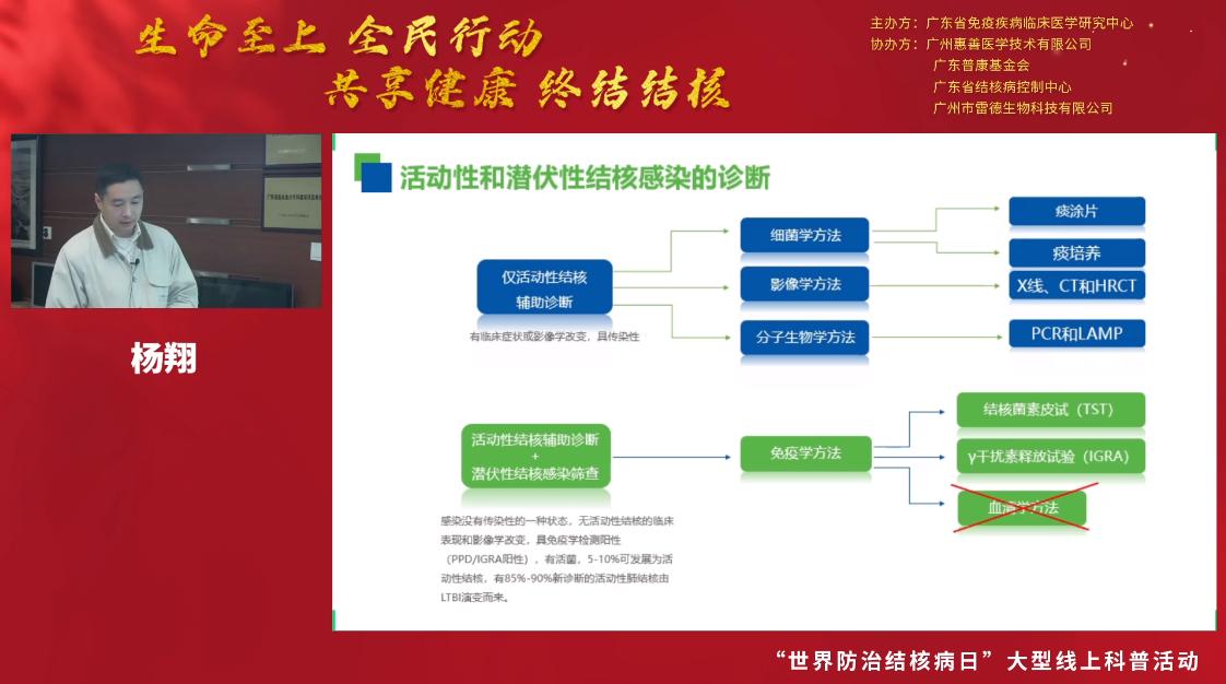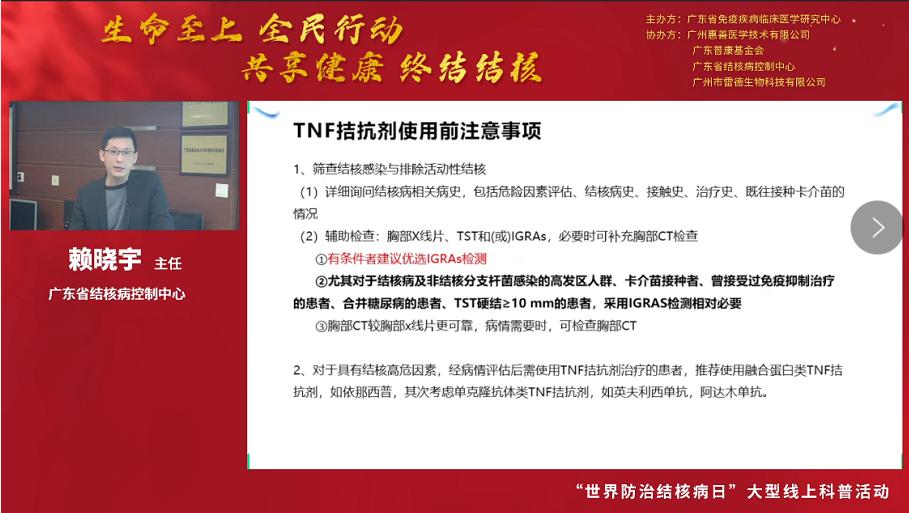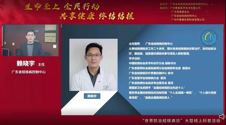 3月24日是第27個“世界防治結核病日”,今年的主題是“生命至上 全面行動 共享健康 終結結核”。為促進公眾對結核病感染危害及其檢測手段的了解,引導公眾做好疫情期間結核病的防控工作,2022年3月24日18:00-20:00,廣東省免疫疾病臨床醫學研究中心聯合廣東省結核病控制中心和廣州市雷德生物科技有限公司開展大型線上結核防控知識科普和結核篩查活動。