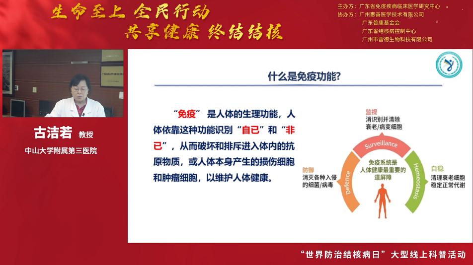 最后中山大學附屬第三醫院教授 、廣東省免疫疾病臨床醫學研究中心主任古潔若女士作了疫情期間免疫力評估意義的主題科普演講,她生動有趣地給線上聽眾講解了人體免疫功能及其免疫細胞群體,獲得線上聽眾一致點贊好評。