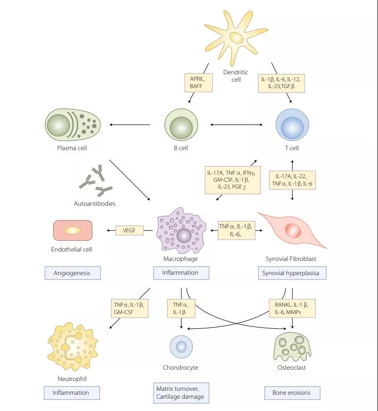 RA主要的三個(gè)病理特征為:炎癥、滑膜增生、骨破壞。與之相對(duì)應(yīng)的參與發(fā)病的細(xì)胞有:免疫細(xì)胞、滑膜細(xì)胞、成骨細(xì)胞和破骨細(xì)胞。