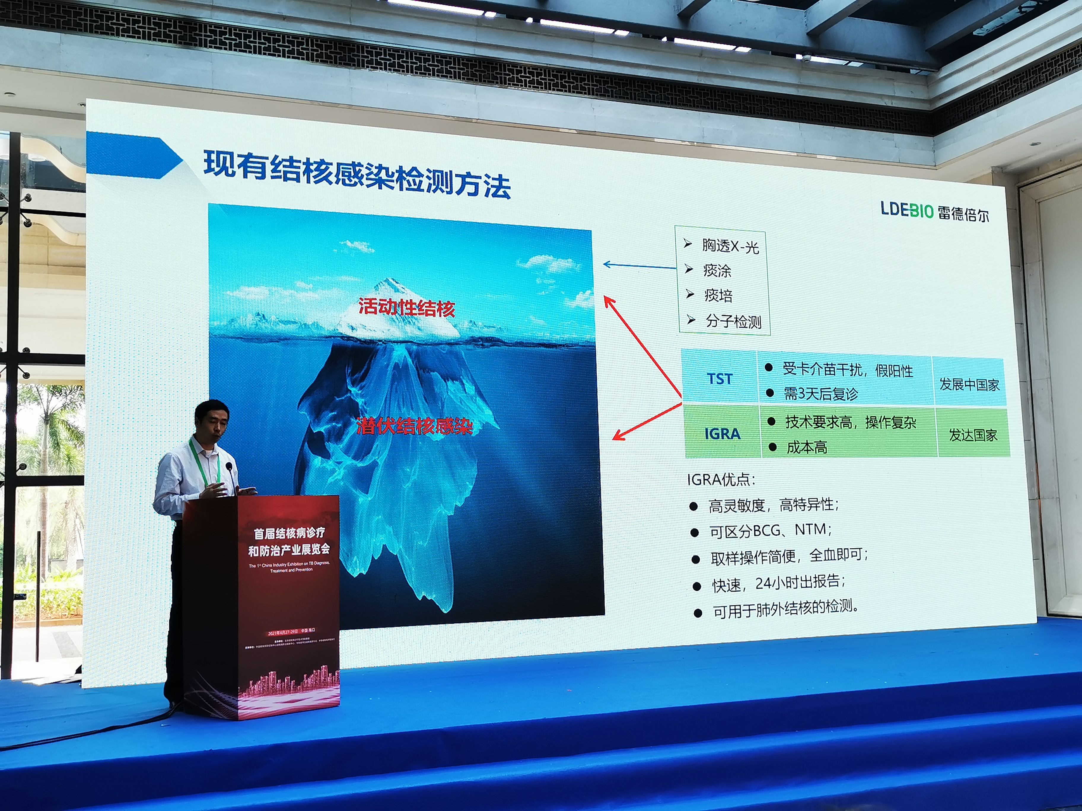 會中,我司還參與本次大會的企業論壇演講,研發副總楊翔博士分享適合高負擔國家結核感染檢測的IGRA產品報告。他表示,根據2020年WHO全球結核病報告,2019年,全球約1000萬人感染結核病。結核死亡患者約141萬。而中國新發患者數約83.3萬,居全球第三位。因此,預防控制結核感染依舊刻不容緩。但由于傳統的結核檢測方法操作復雜,假陽性率高,不利于深入基層篩查。市場迫切需要一款成本可控,結果準確,可以基層普及的檢測方法。